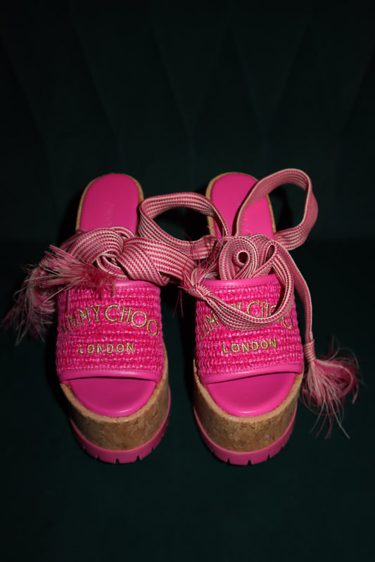 Pre-Owned Jimmy Choo Raffia Embroidered Wedge Sandals