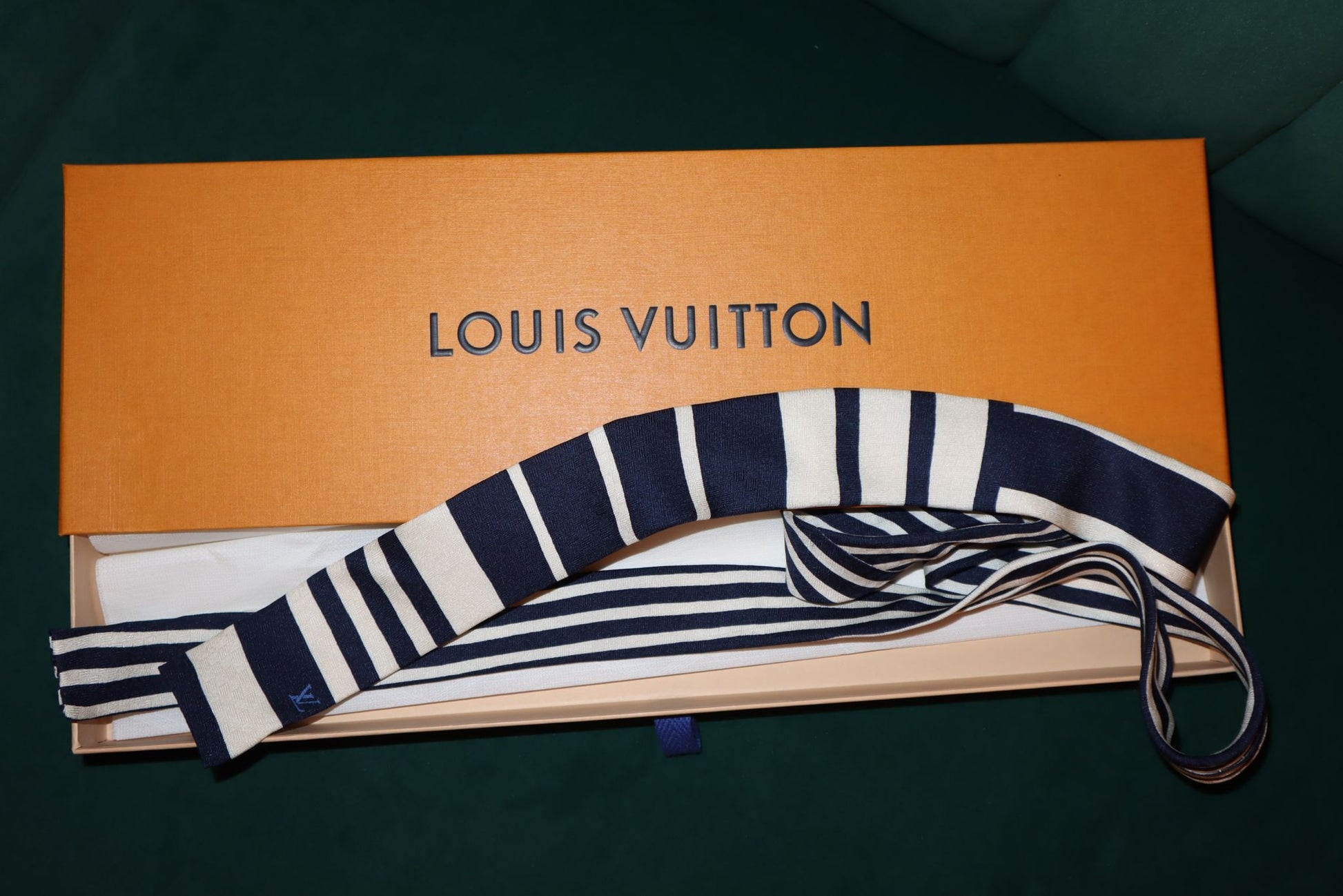 This Louis Vuitton tie boasts a sophisticated design with navy blue and white stripes on smooth silk. Crafted with impeccable attention to detail, it exudes luxury and refinement. Elevate any outfit with this classic and versatile accessory.