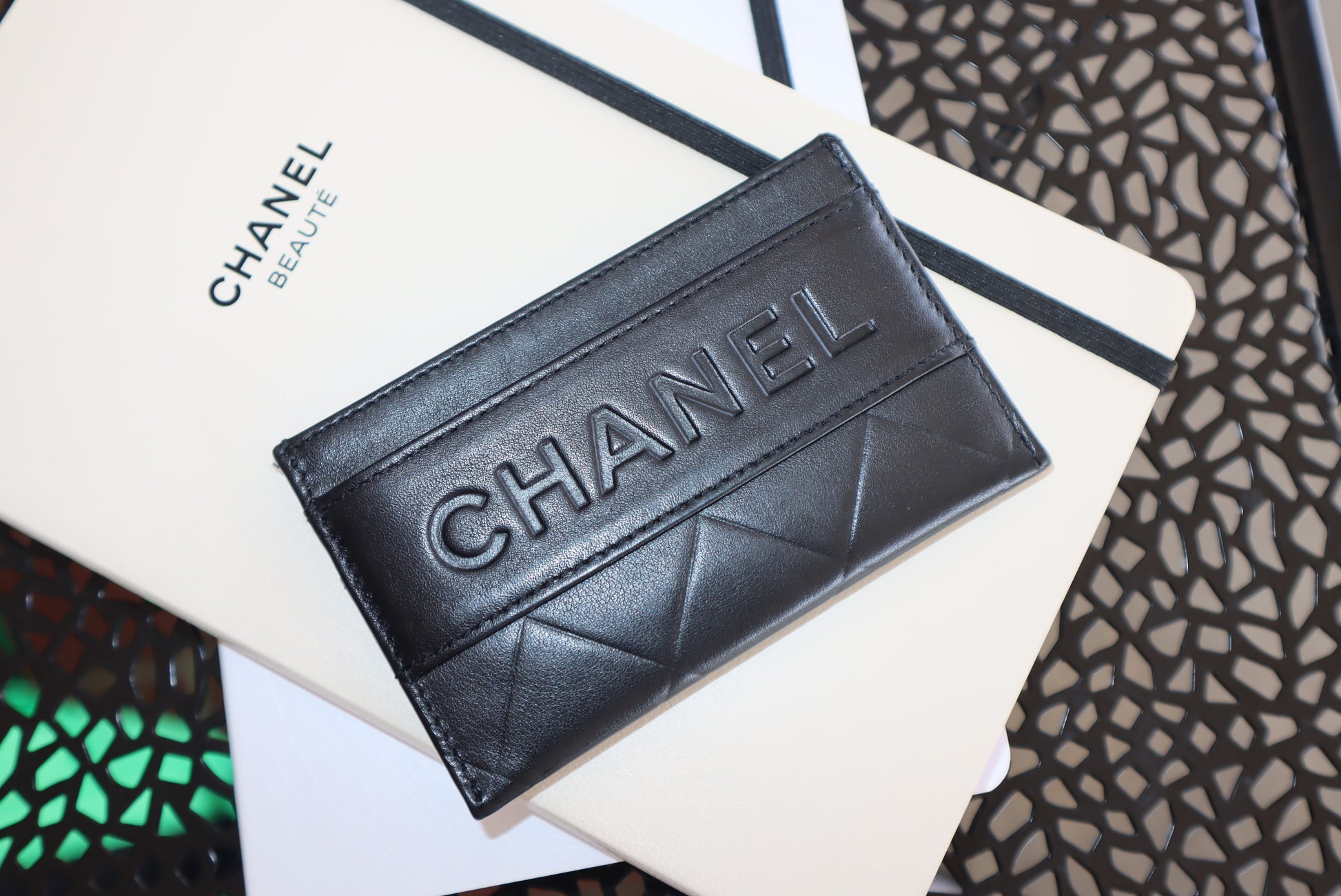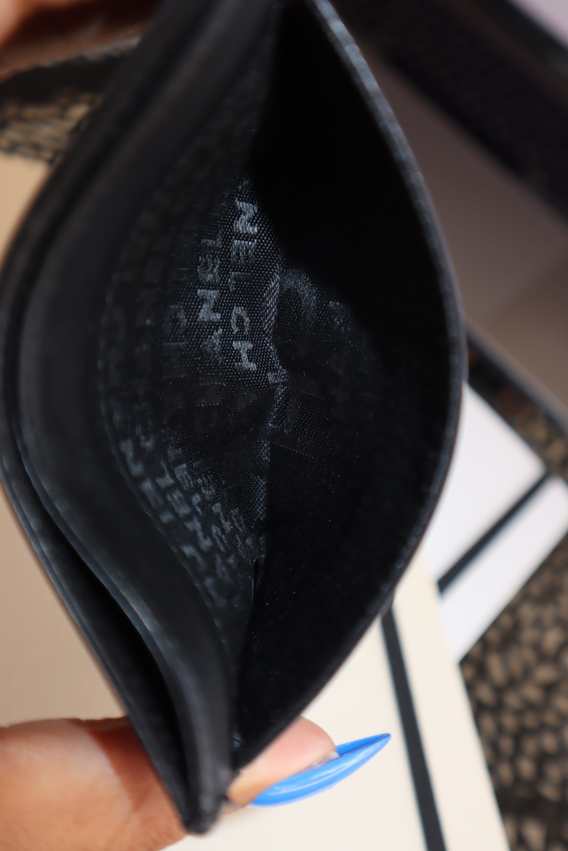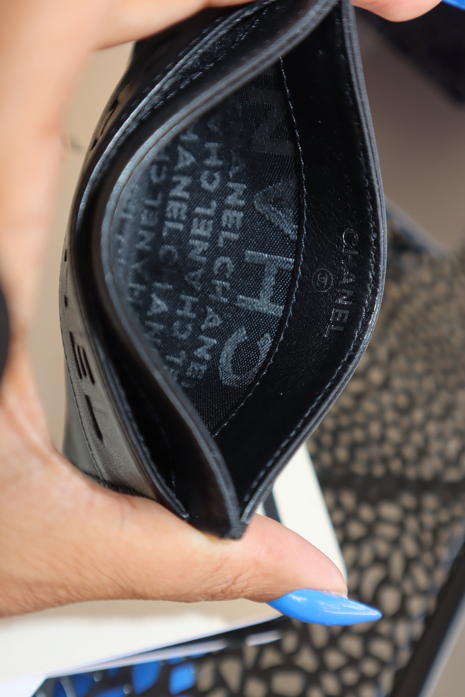 In Rank A condition, this black lambskin card holder features the hologram still attached, free from deep scratches or cracks, and has not been repainted. It includes original packaging.