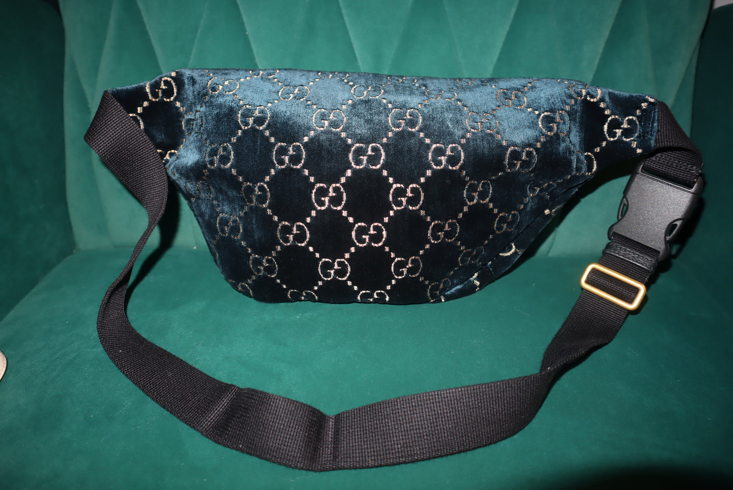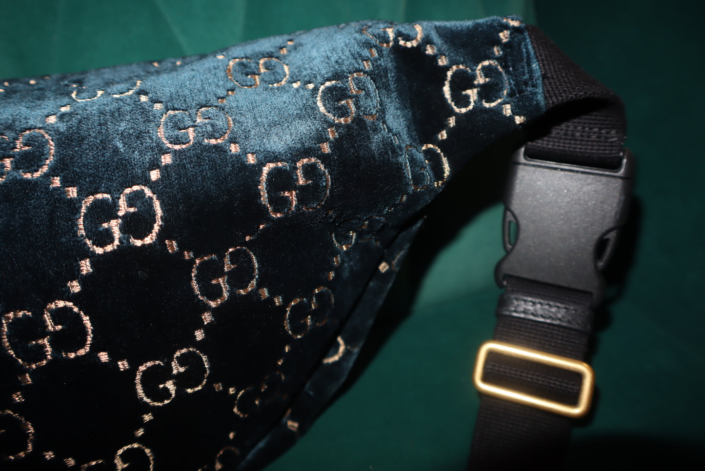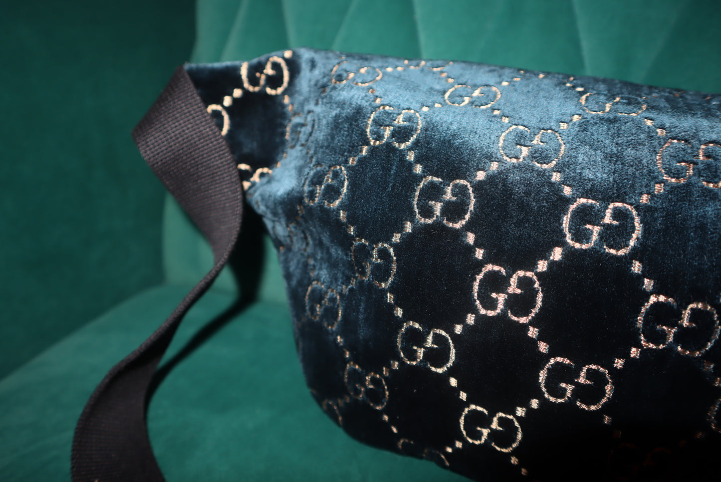 Introducing the GUCCI Velvet GG Monogram Web Belt Bag, a stylish and functional accessory designed to elevate your everyday look. This blue-beige inside bum/body bag is crafted from high-quality velvet, ensuring a luxurious feel.