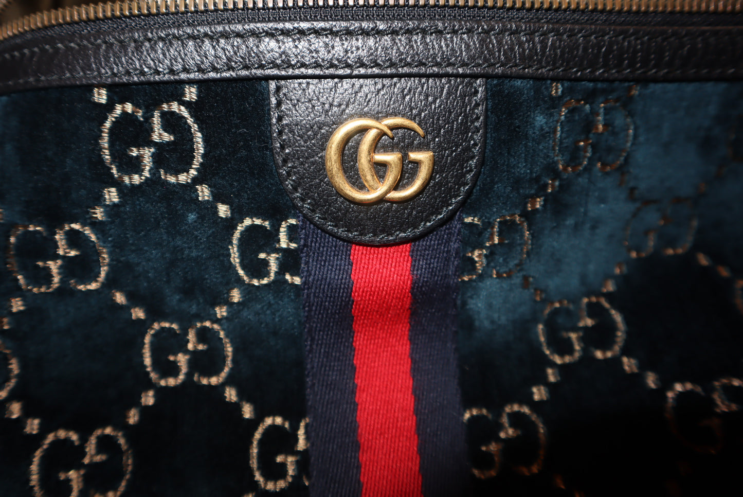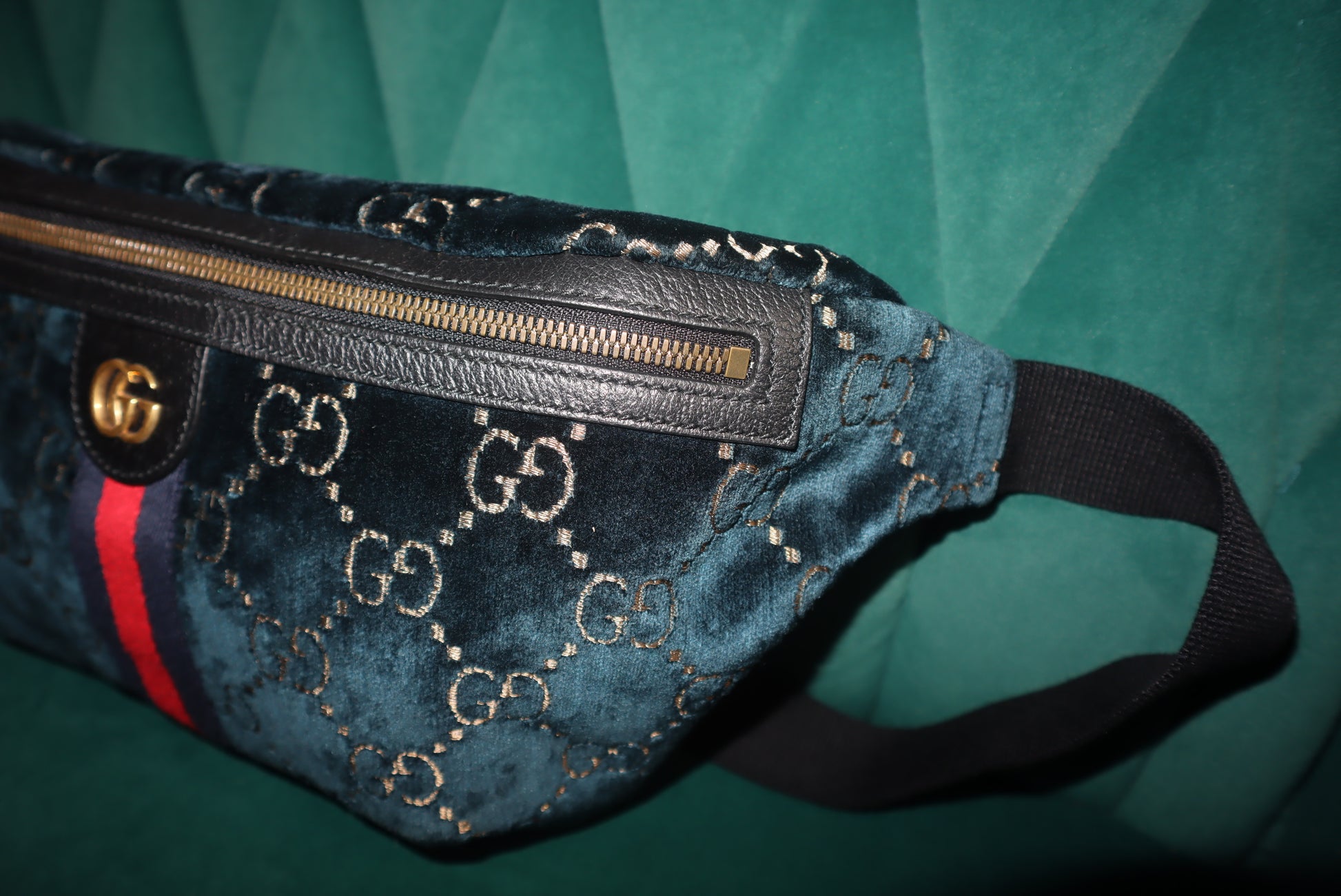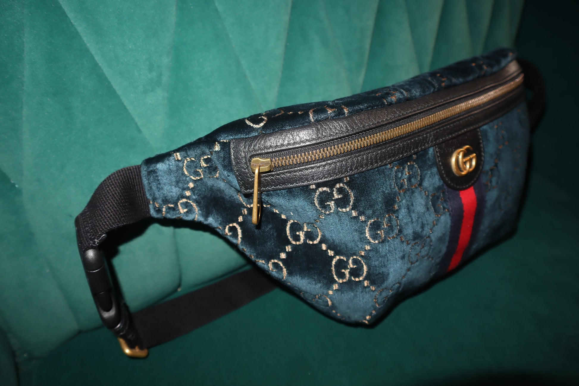 Introducing the GUCCI Velvet GG Monogram Web Belt Bag, a stylish and functional accessory designed to elevate your everyday look. This blue-beige inside bum/body bag is crafted from high-quality velvet, ensuring a luxurious feel.