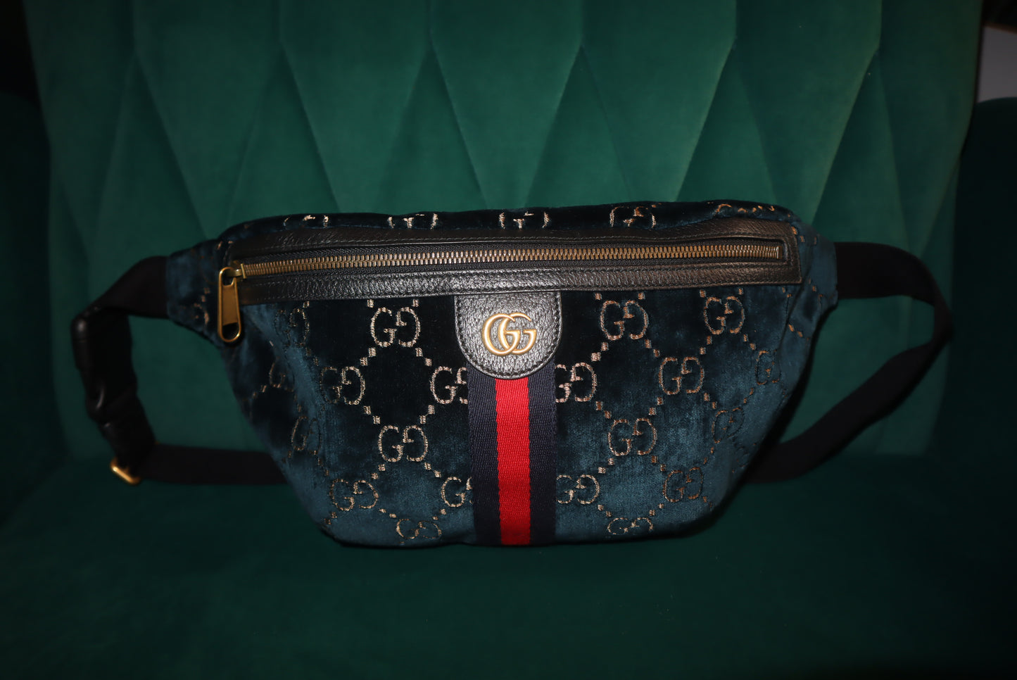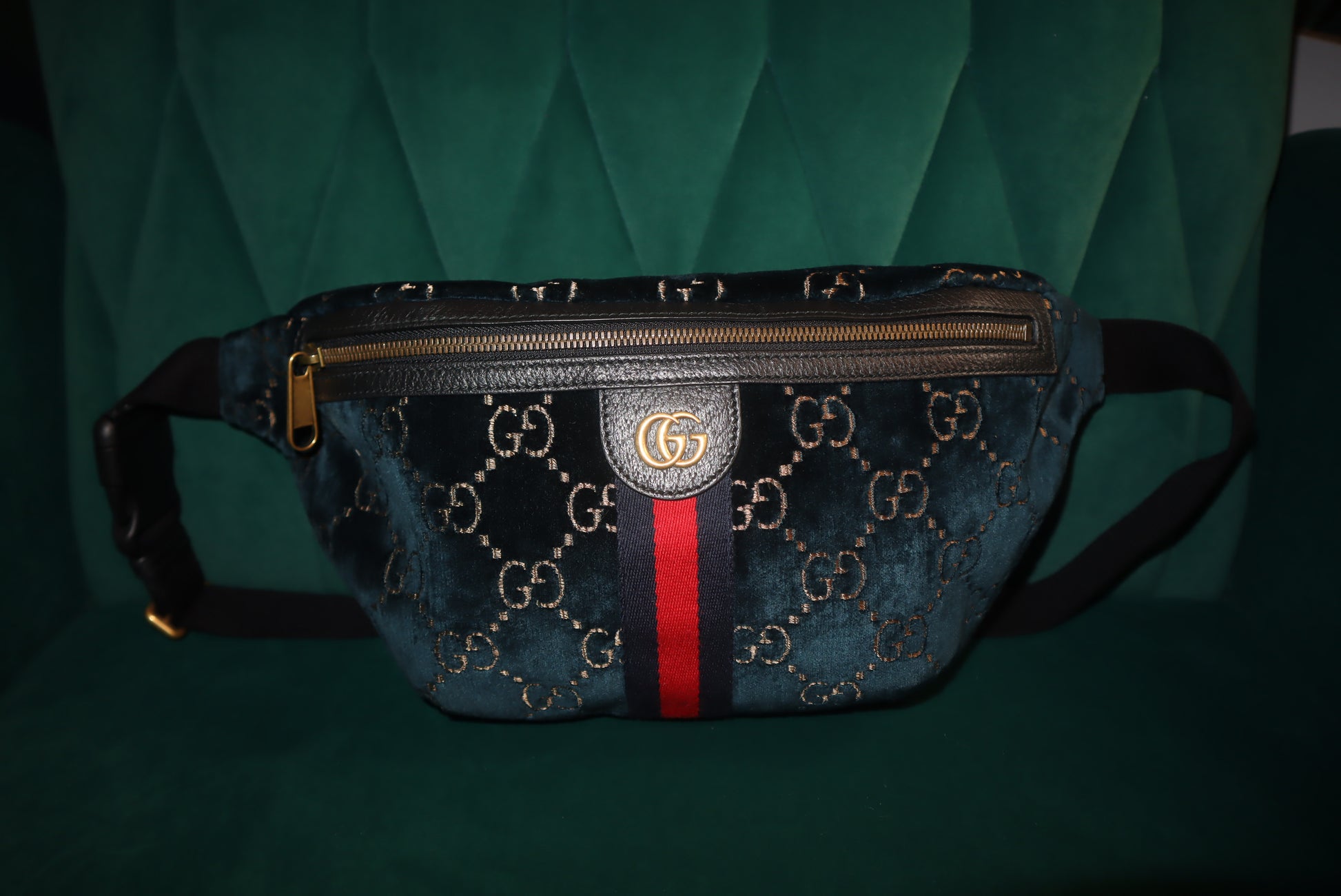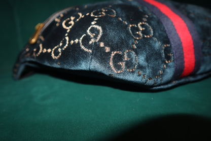 Elevate your style with this GUCCI Velvet GG Monogram Web Belt Bag, a perfect blend of luxury and practicality.