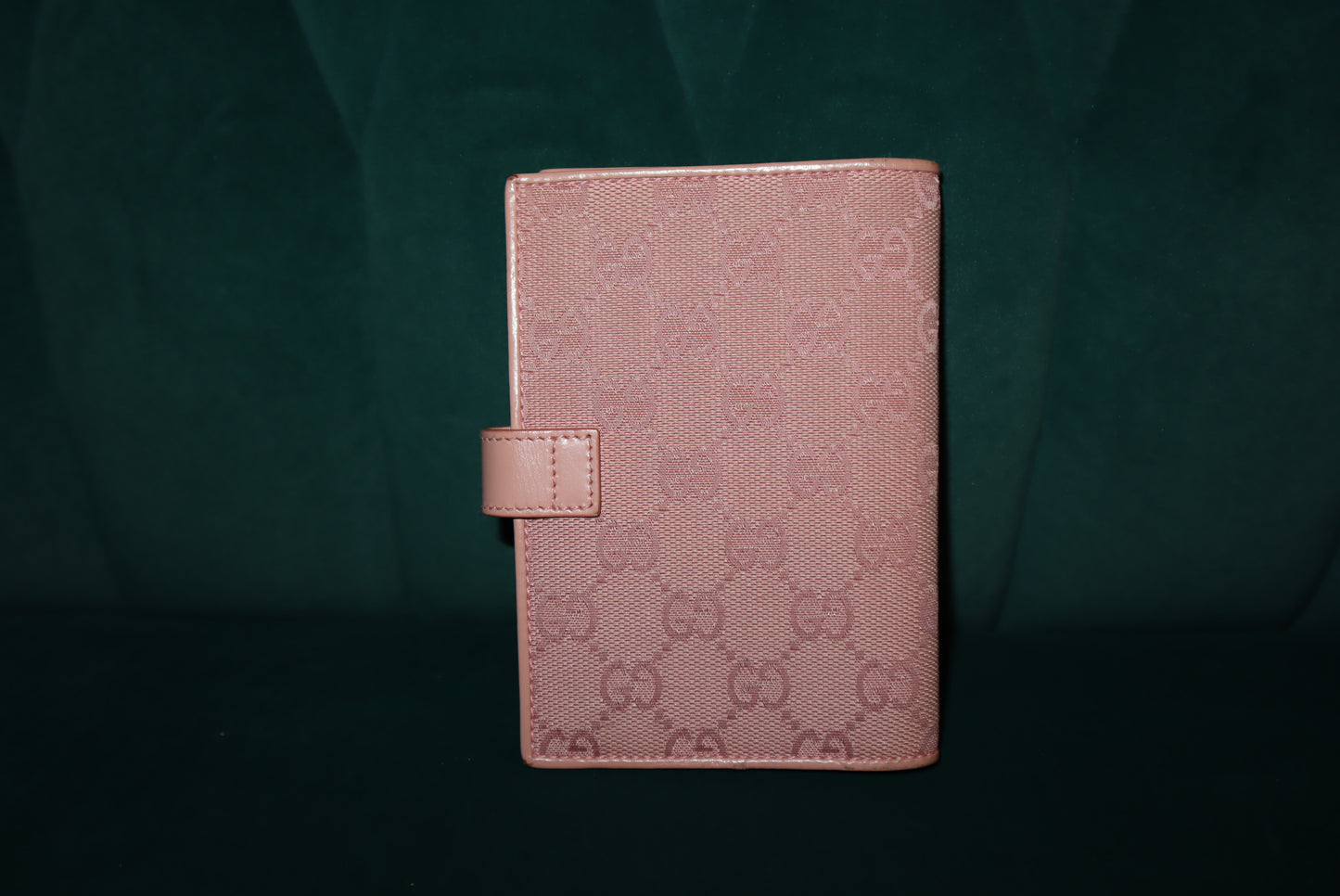 Compact and stylish, the Gucci Monogram Small Ring Agenda in Pink is ideal for organizing your daily life. Made of durable materials and featuring the iconic Gucci monogram, this pre-loved planner is the perfect fusion of fashion and functionality. Stay on top of your schedule and make a statement with Gucci.