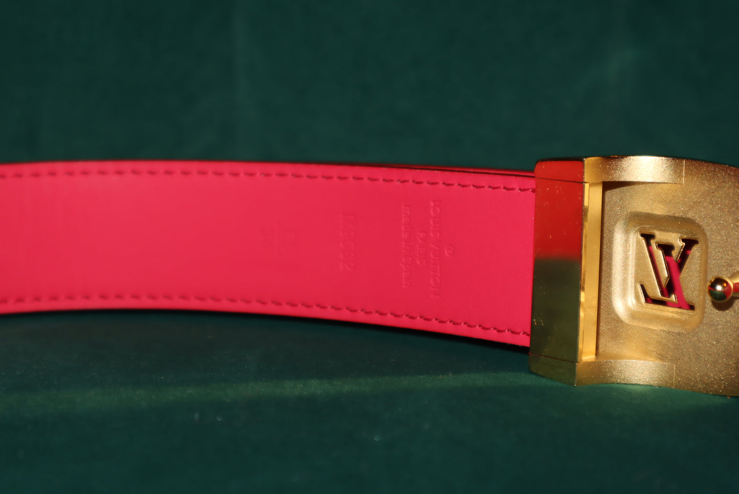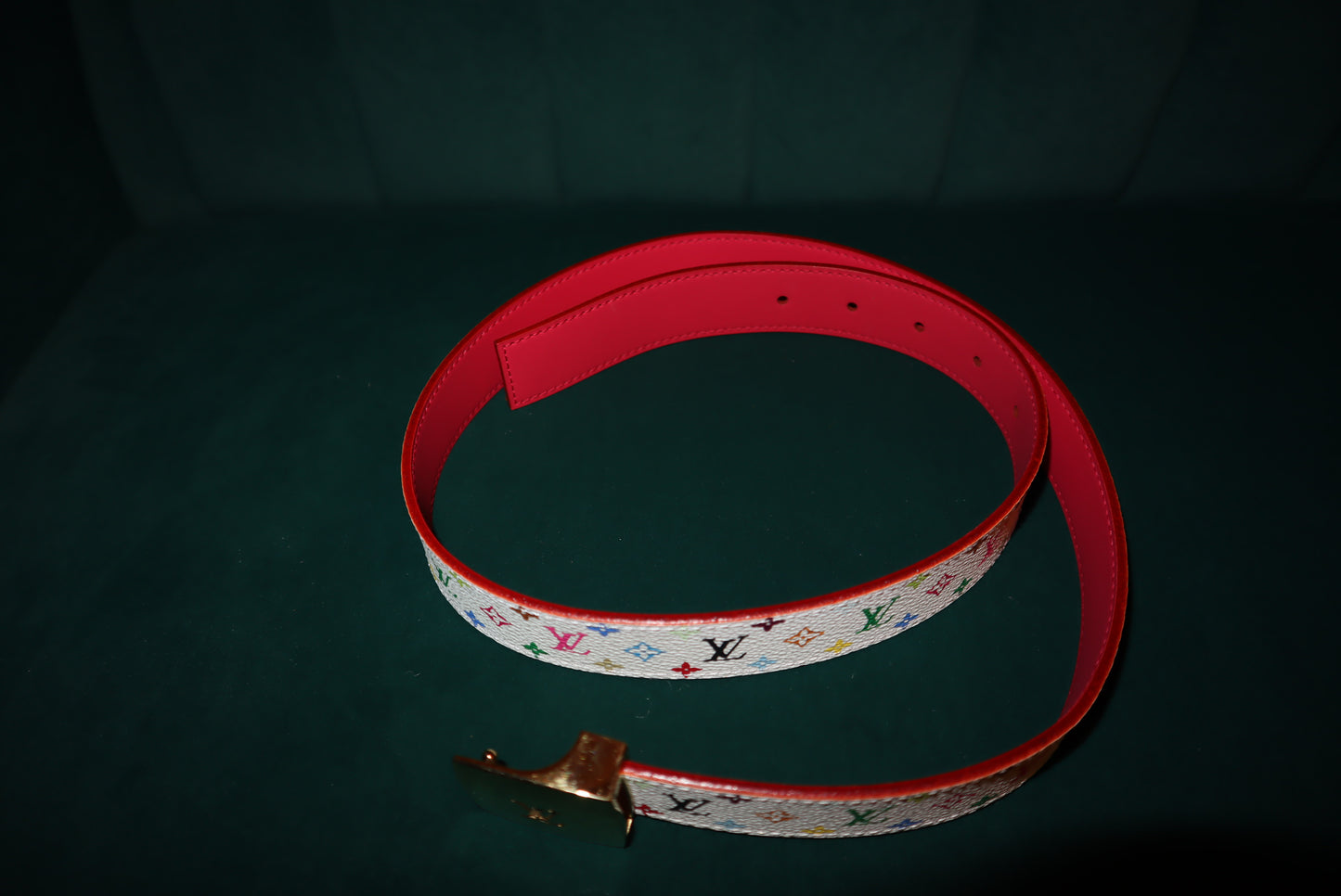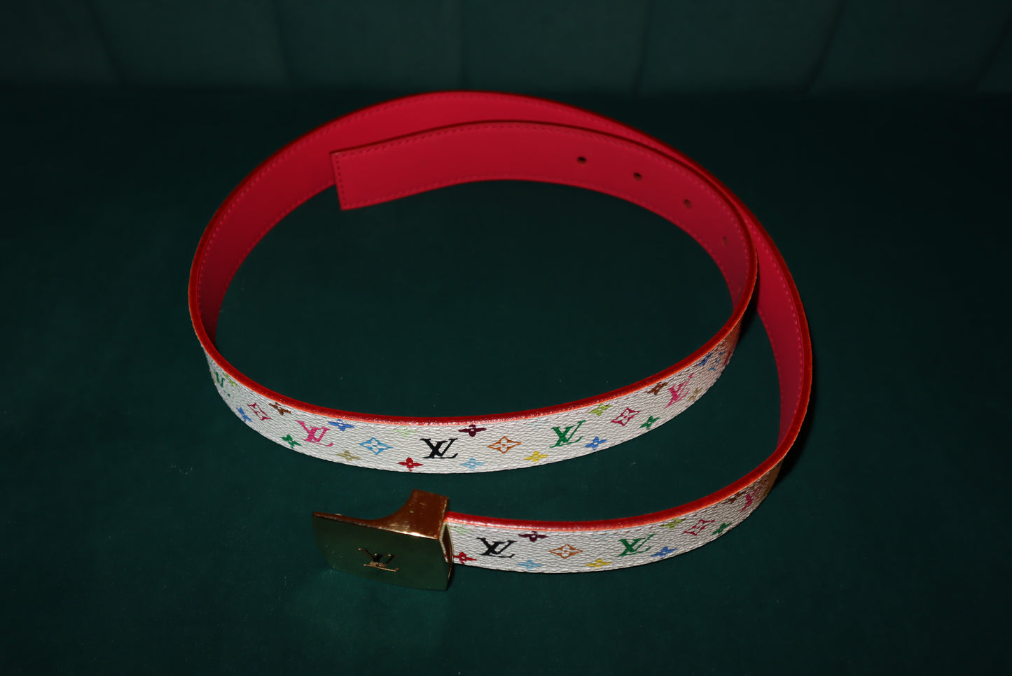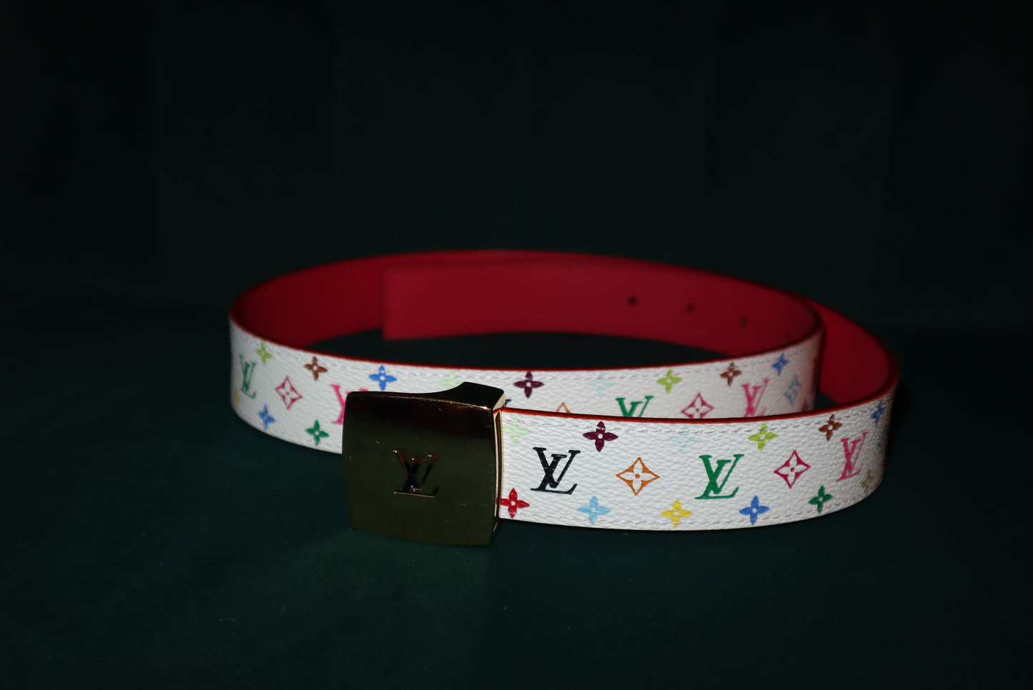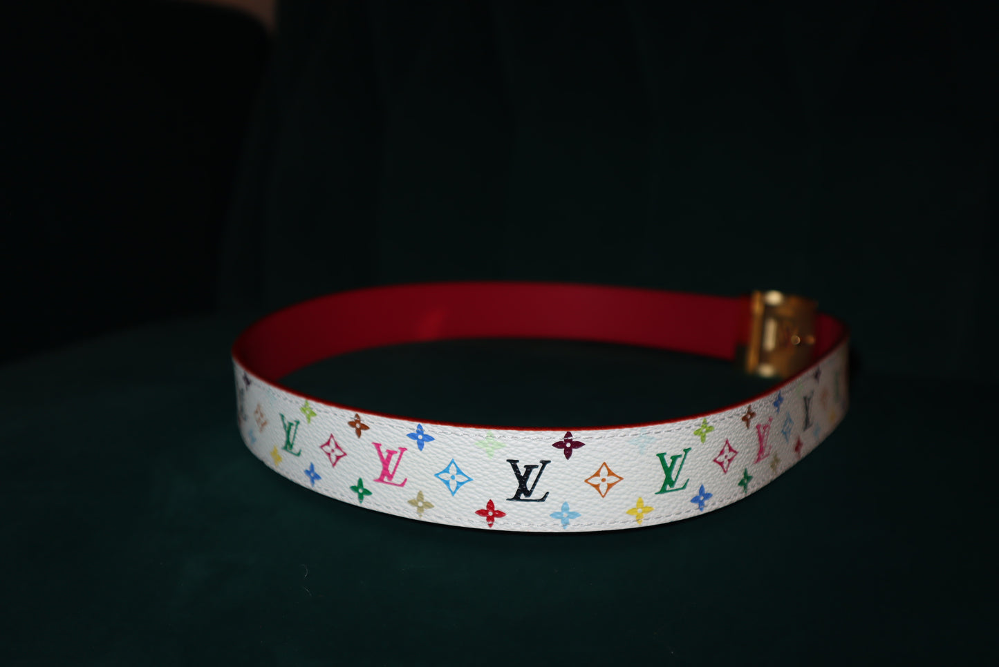 A statement of bold luxury, this Louis Vuitton reversible belt features the iconic Multicolore Monogram, originally designed in collaboration with Takashi Murakami. With 33 vibrant colors adorning the classic white canvas, this belt is a collector’s dream, blending heritage with contemporary flair.