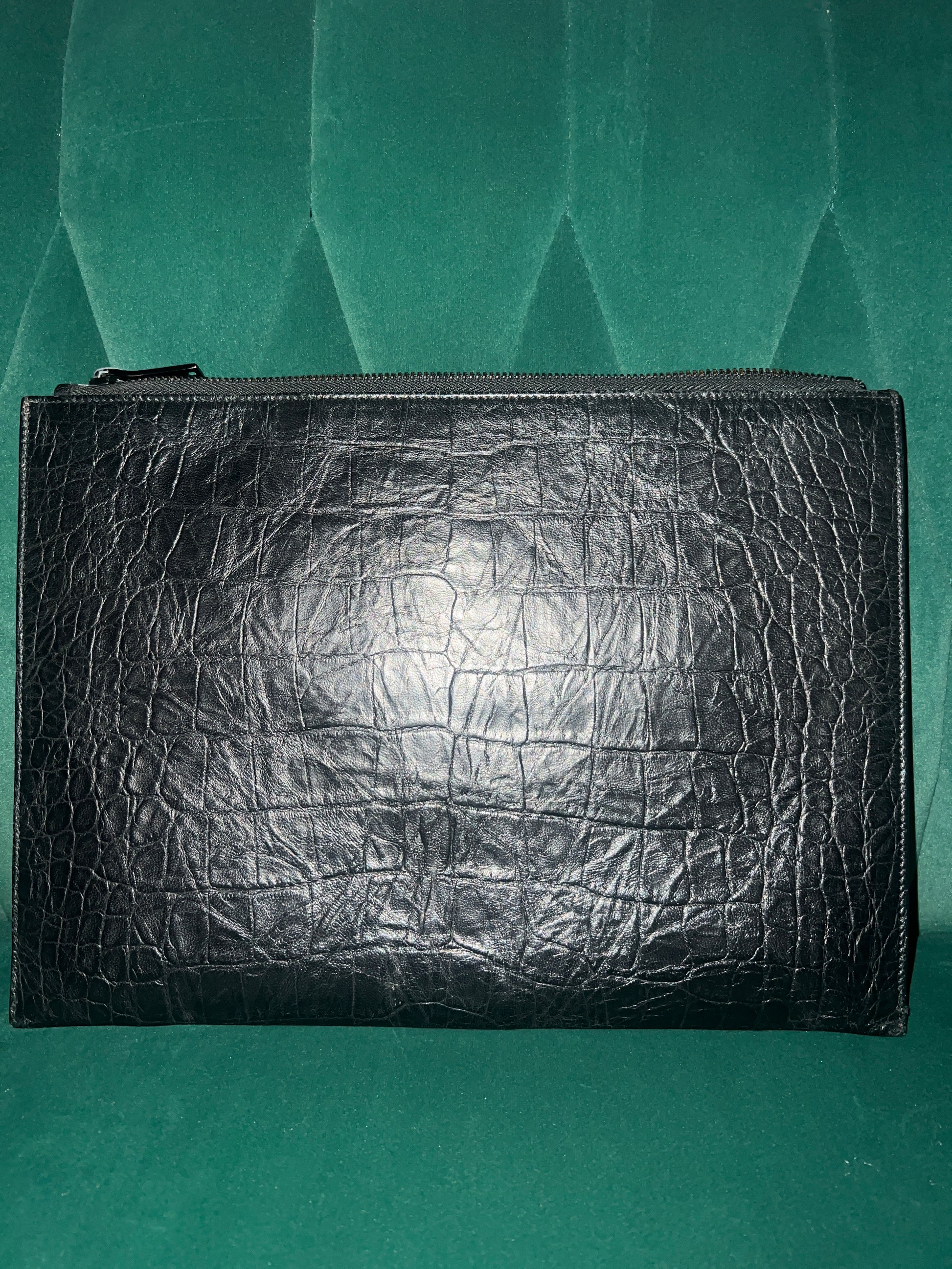 Saint Laurent Calfskin Crocodile Embossed Monogram Document Holder Black Pre-Owned Medium