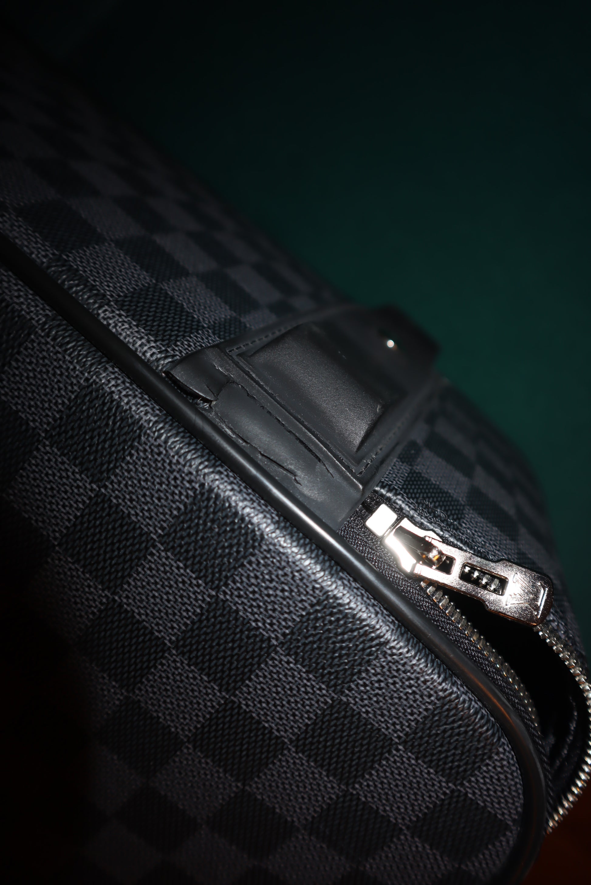 Louis Vuitton's Pégase 55 carry-on features the Navy Blue Damier Ebene canvas with silver hardware and includes a dustbag. It shows a crack with loose threads in the folding area and a minor mark on the front corner and back. The zipper functions perfectly, and the bag is free from stains, rust, and other wear, maintaining a clean and well-preserved condition.
